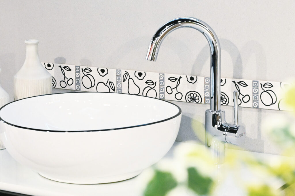 まず目を引くのは、スペインからの輸入品ならではの色合いと柄だ。イスラム文化由来の幾何学模様やアラベスク模様と、イベリア半島らしい鮮やかな色彩が重なり合うことで独特の個性を生み出している。日本製ではなかなか見られない落ち着いたゴールドのボーダーや、爽やかなホワイトベースのフルーツ柄など、現地の日常の中で屋内外を問わず彩りを与え、親しまれてきた豊かな装飾をプラスすることで、洗面空間にまた違った表情を生み出す。