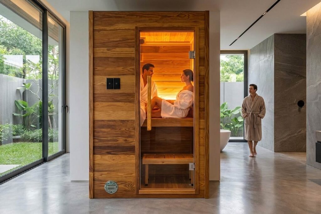 続いて見せてくれたのが、家庭用の組み立て式サウナキャビンの「IRORI NUBO (イロリ ヌーボ)」。こちらはテントタイプをよりパワーアップさせたまるでインテリアのような”ととのう家具”です。施工は2~3時間ほどで、パネルを組み上げれば室内に本格的な空間が出現。単相で200Vの電源工事が完了していれば、その日のうちに使えてしまいます。